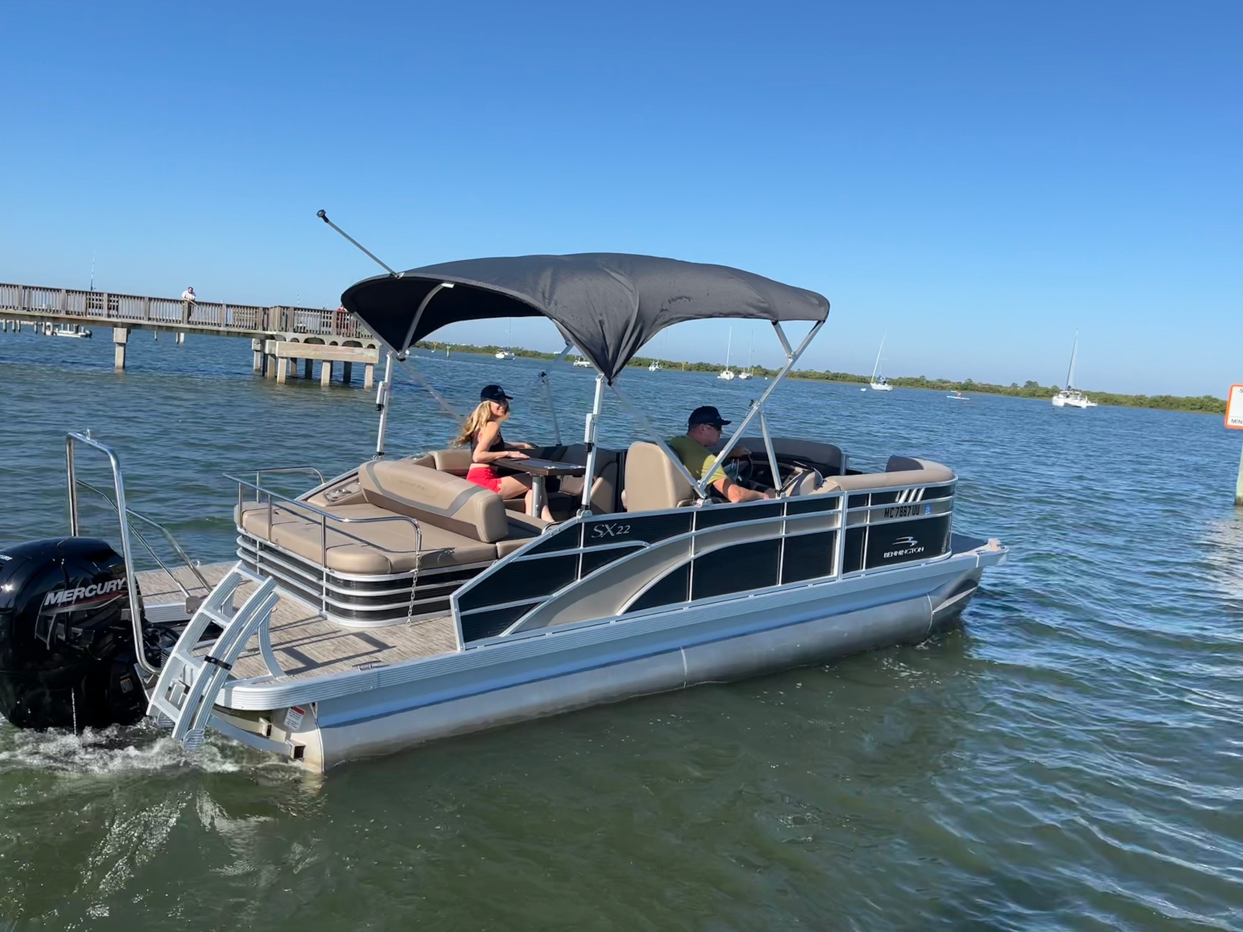 Welcome aboard this beautiful 22ft Bennington tritoon- designed for relaxing, sunbathing and chilling on the water. Guests love the comfortable platform bed in the back, bow filler cushion and a nice 4 speaker Bluetooth-compatible sound system.