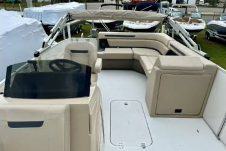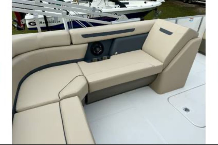 This powerful Yamaha 150hp monohull offers the spacious layout of a pontoon, giving you plenty of room to spread out and relax. Premium features include Garmin GPS for easy navigating, Bluetooth radio with seatback speakers, built-in cooler, and waterproof storage at your fingertips.